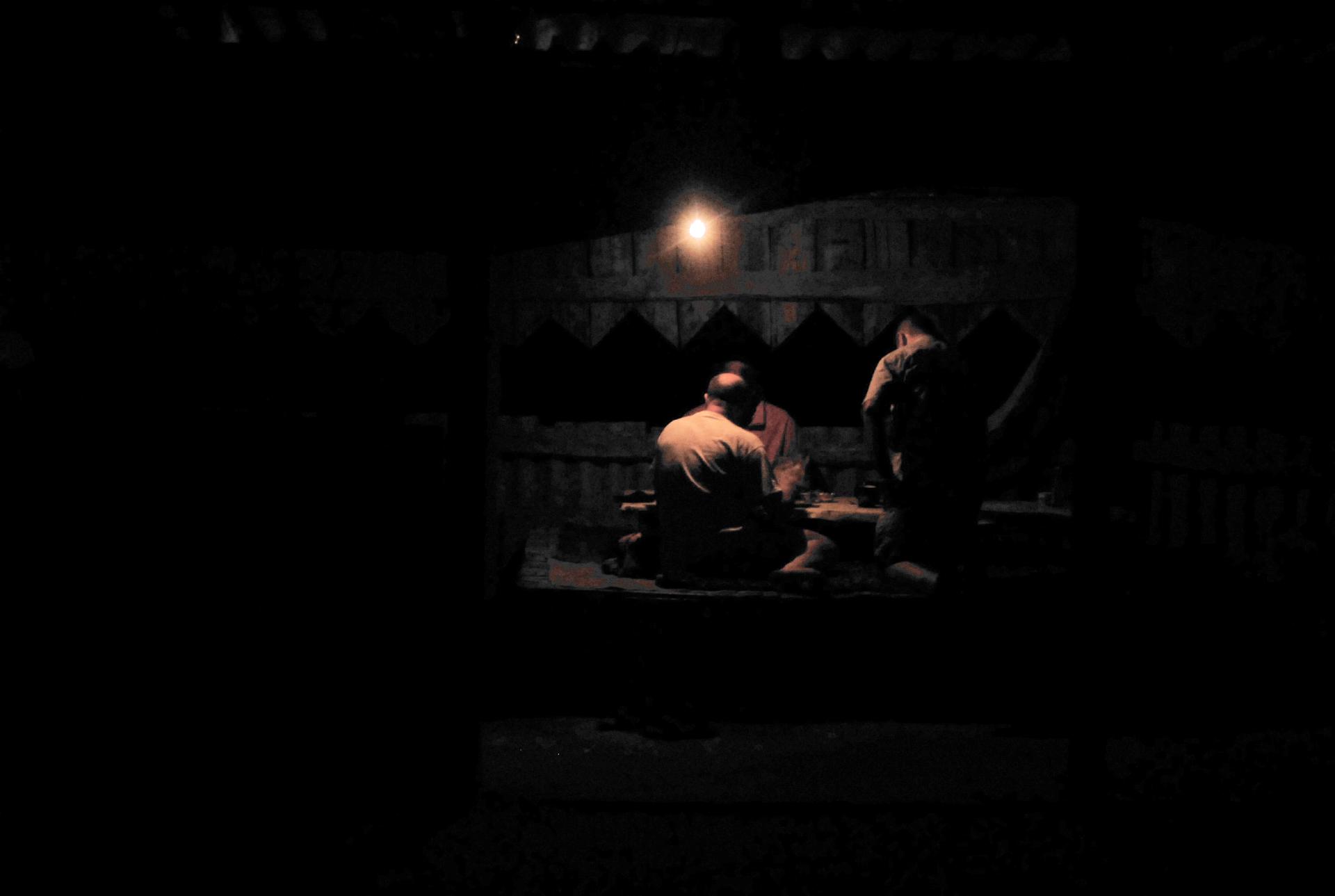 sono completamente al buio vediamo le loro scarpe, una dozzina di paia, allineate lungo il gazebo, non osiamo approfittare, non li