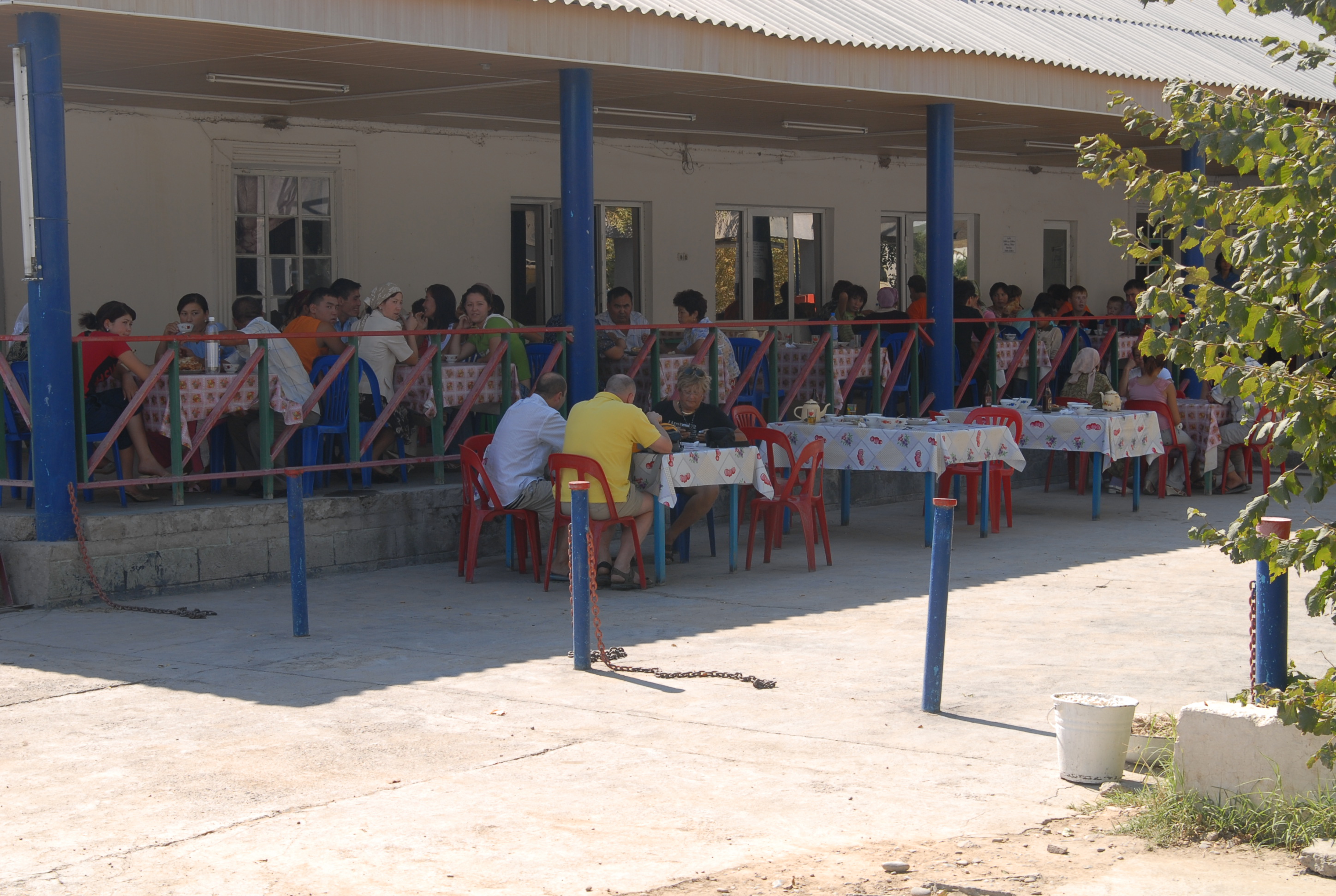 shashlik di pollo. Mentre mangiamo vediamo nel cortile una catena umana che si passa i secchi d'acqua dal pozzo al gabbiotto del bagno. Poi Michal ed io