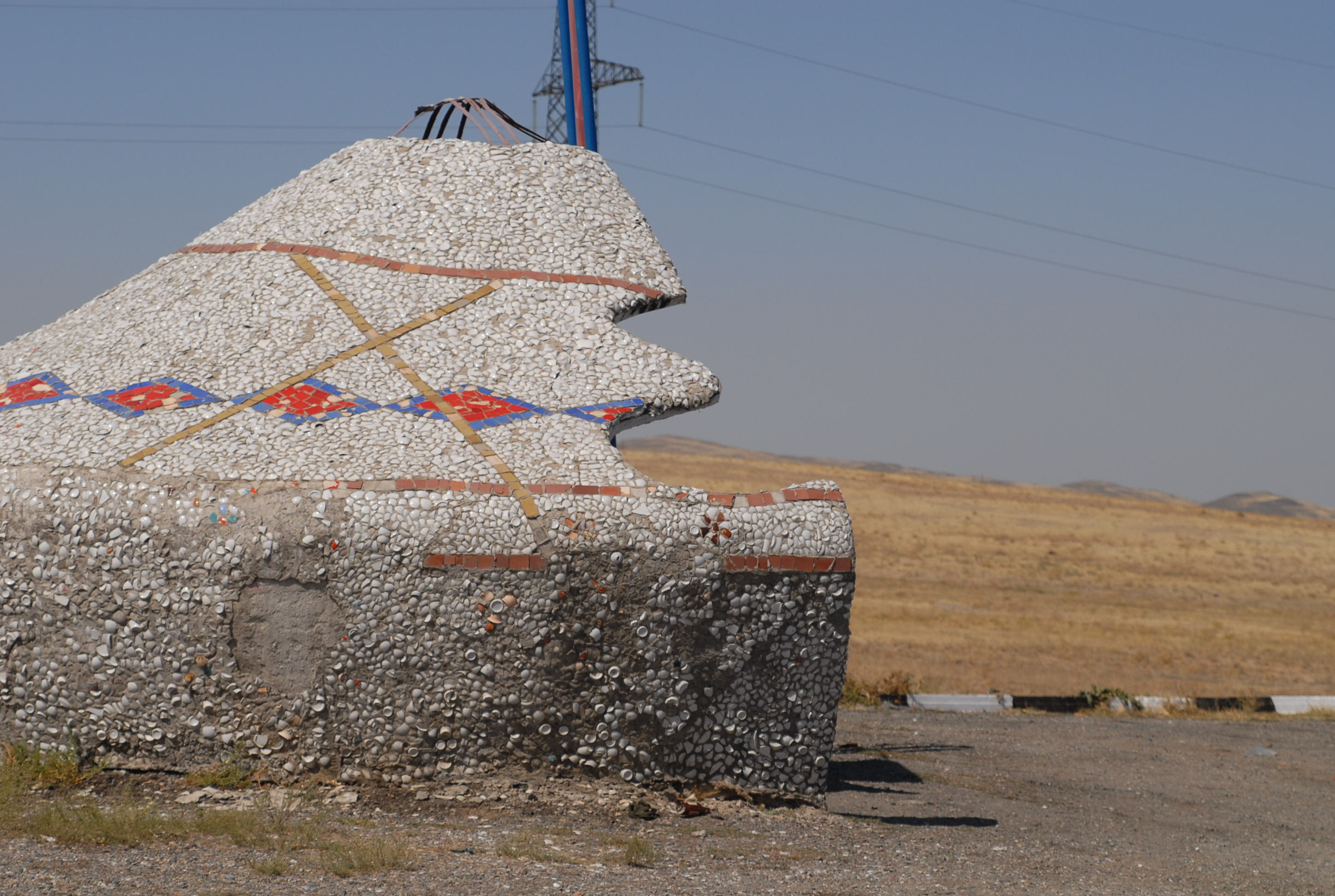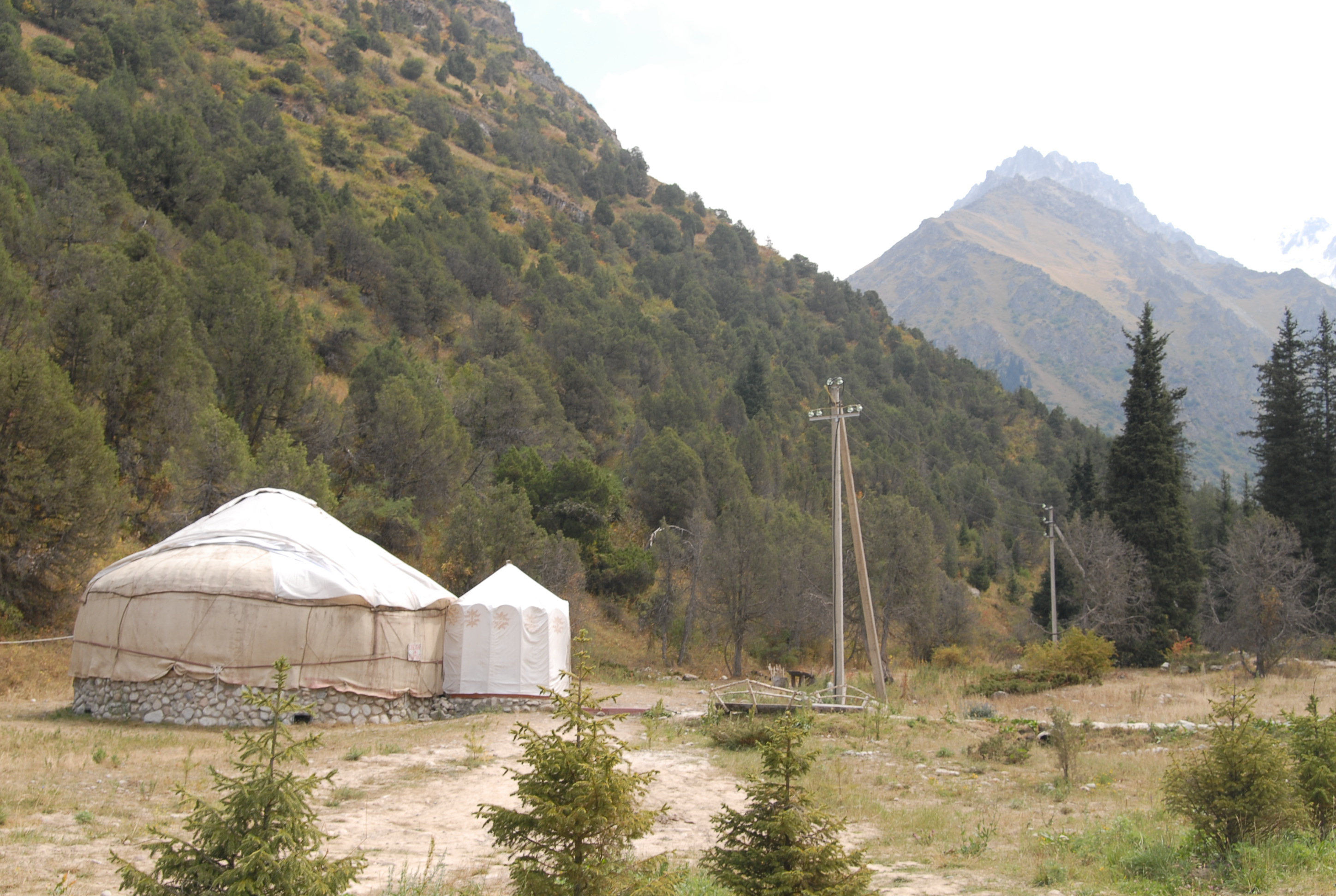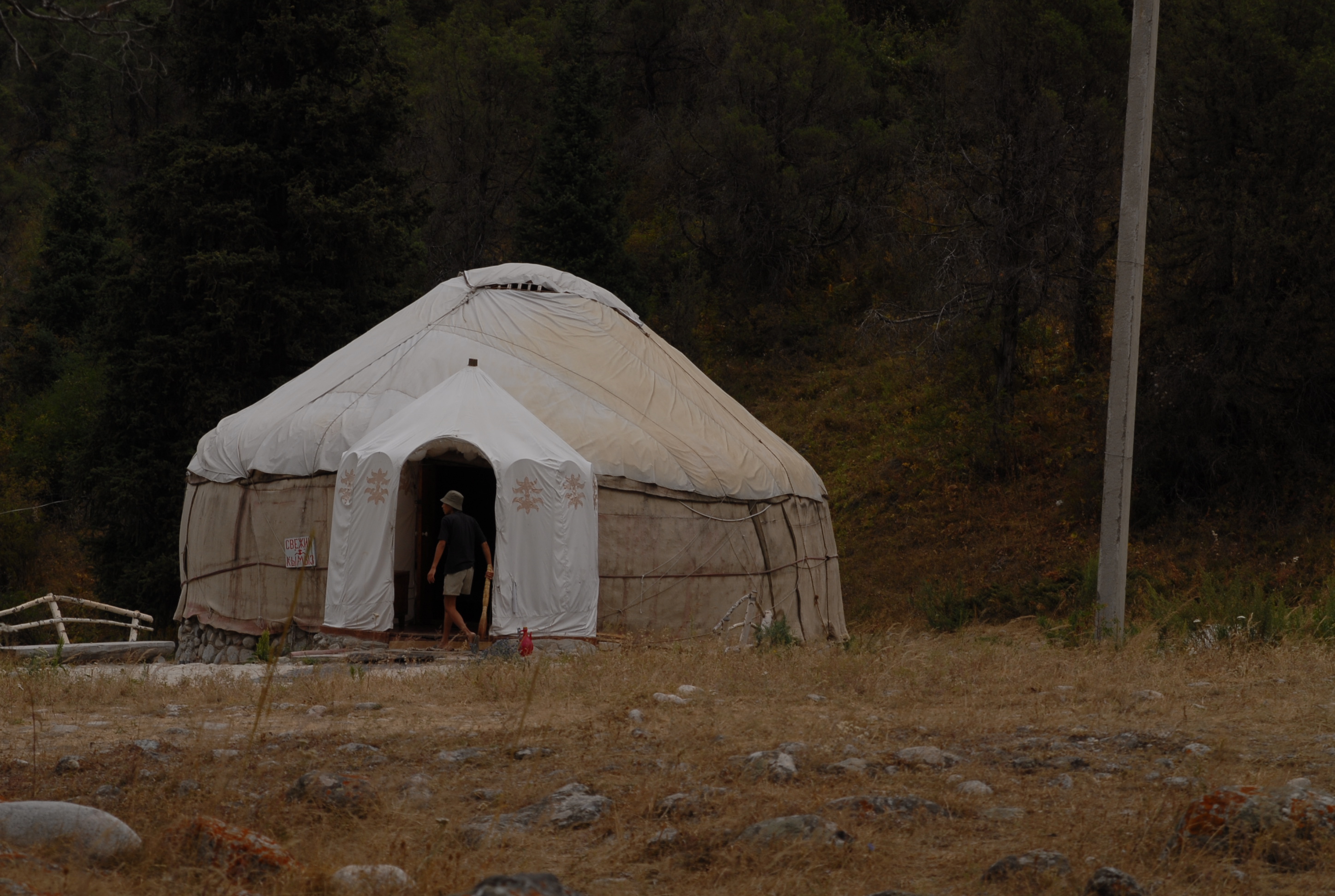 | Vediamo il primo Jurta da vicino (ne abbiamo visto uno in centro città, ma passandoci davanti con la macchina). Dentro sembra quello che io mi immagino sia una tenda indiana, come si vedono nei film dei cowboy. Questo è adibito a bar/ristoro, è molto grande |