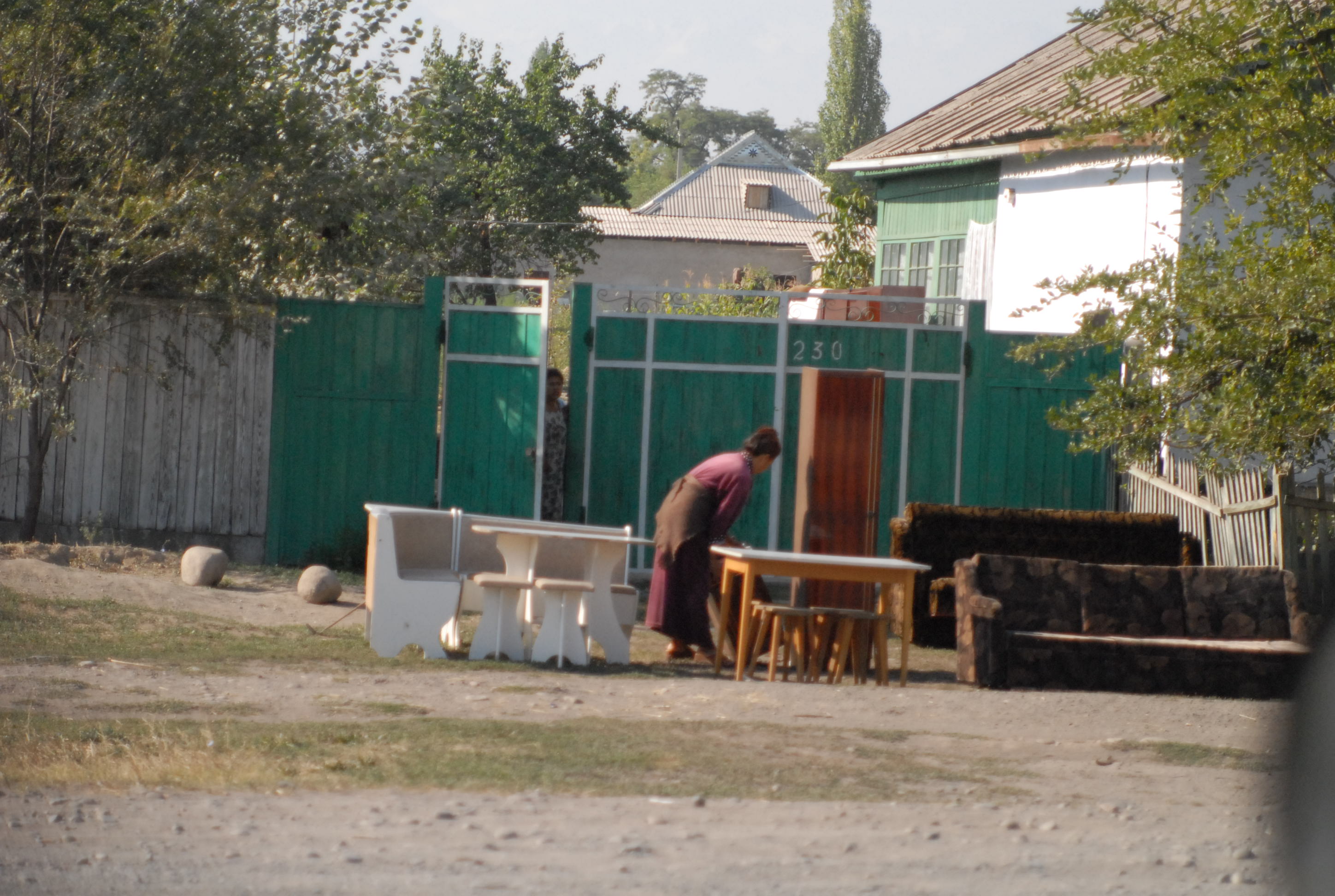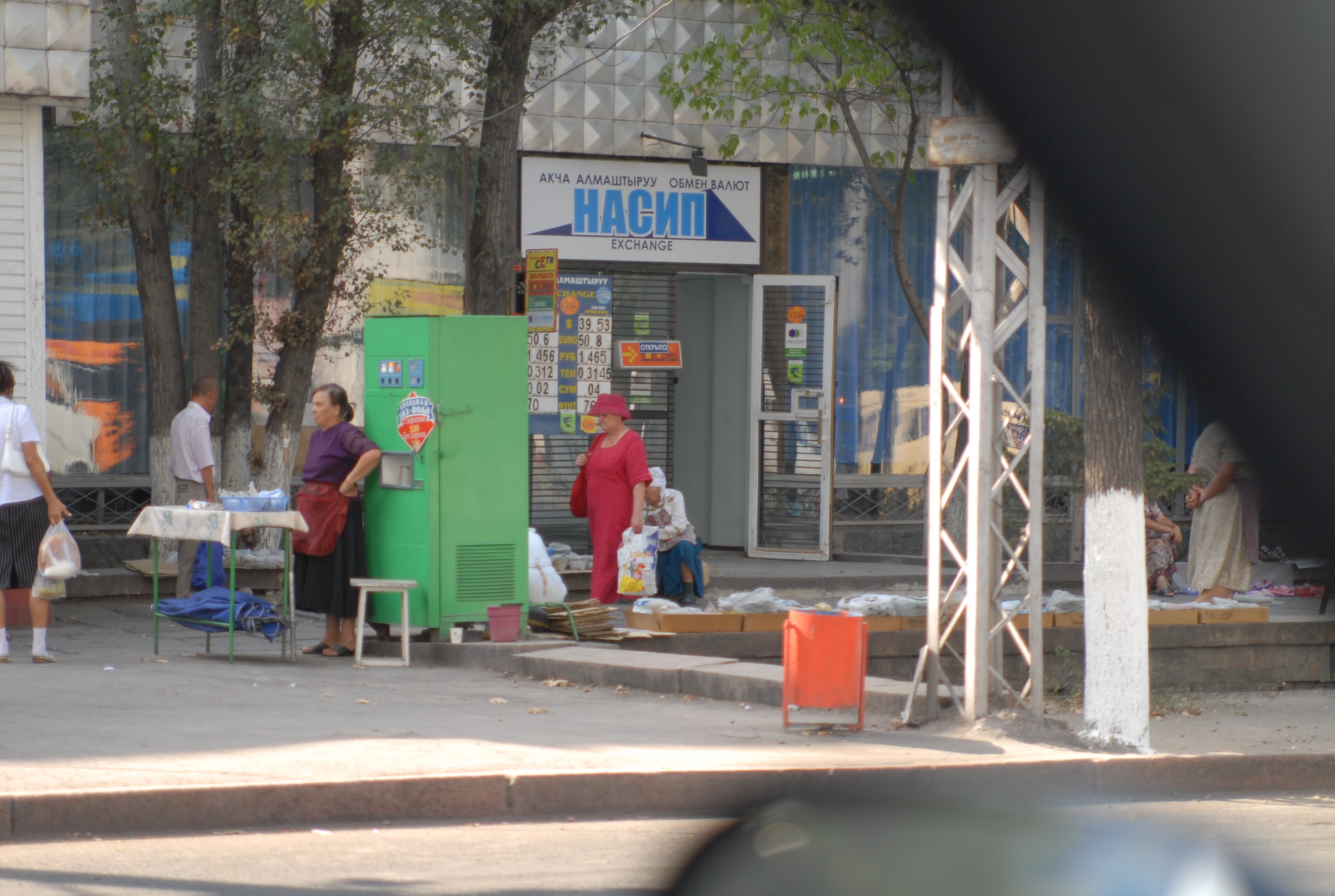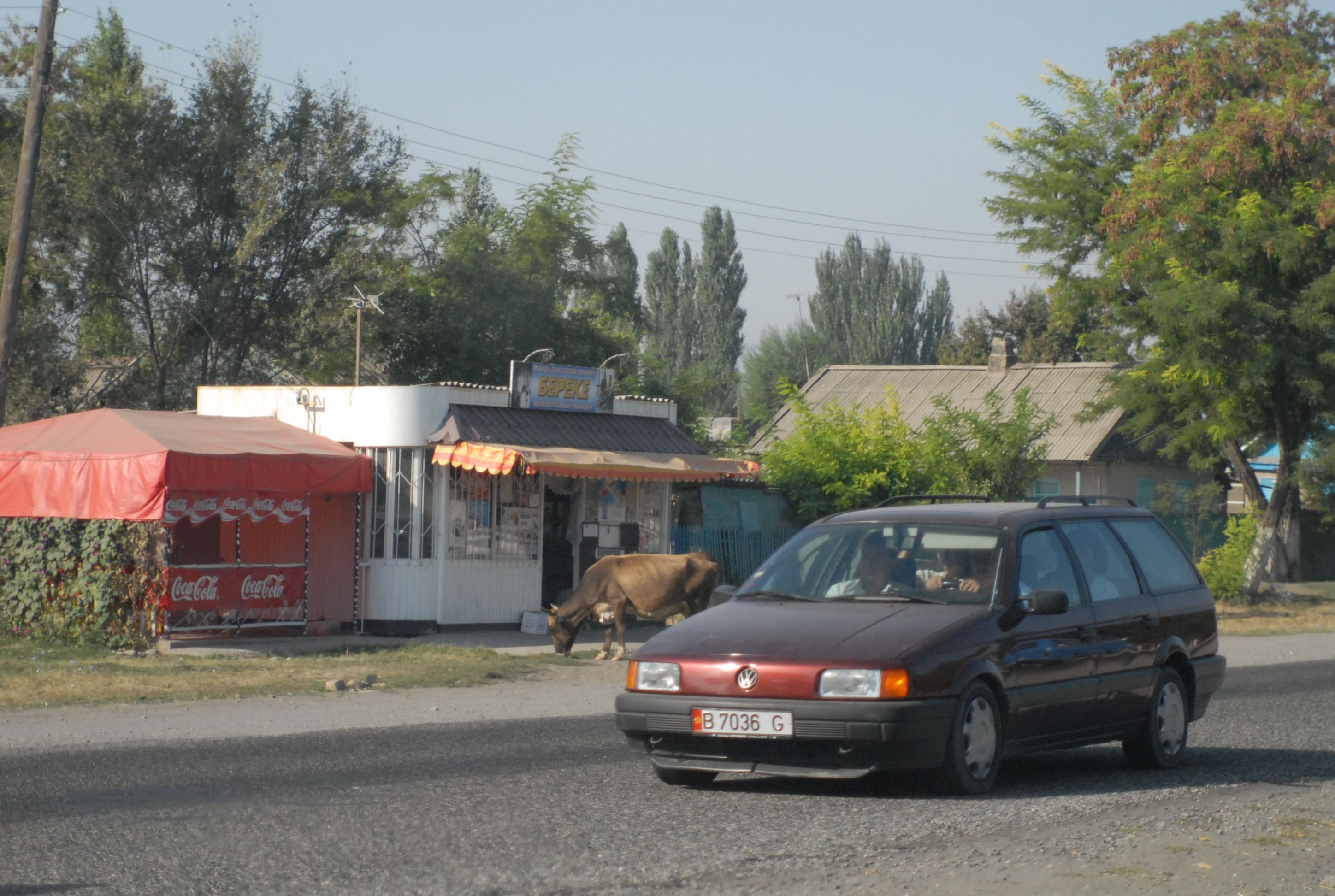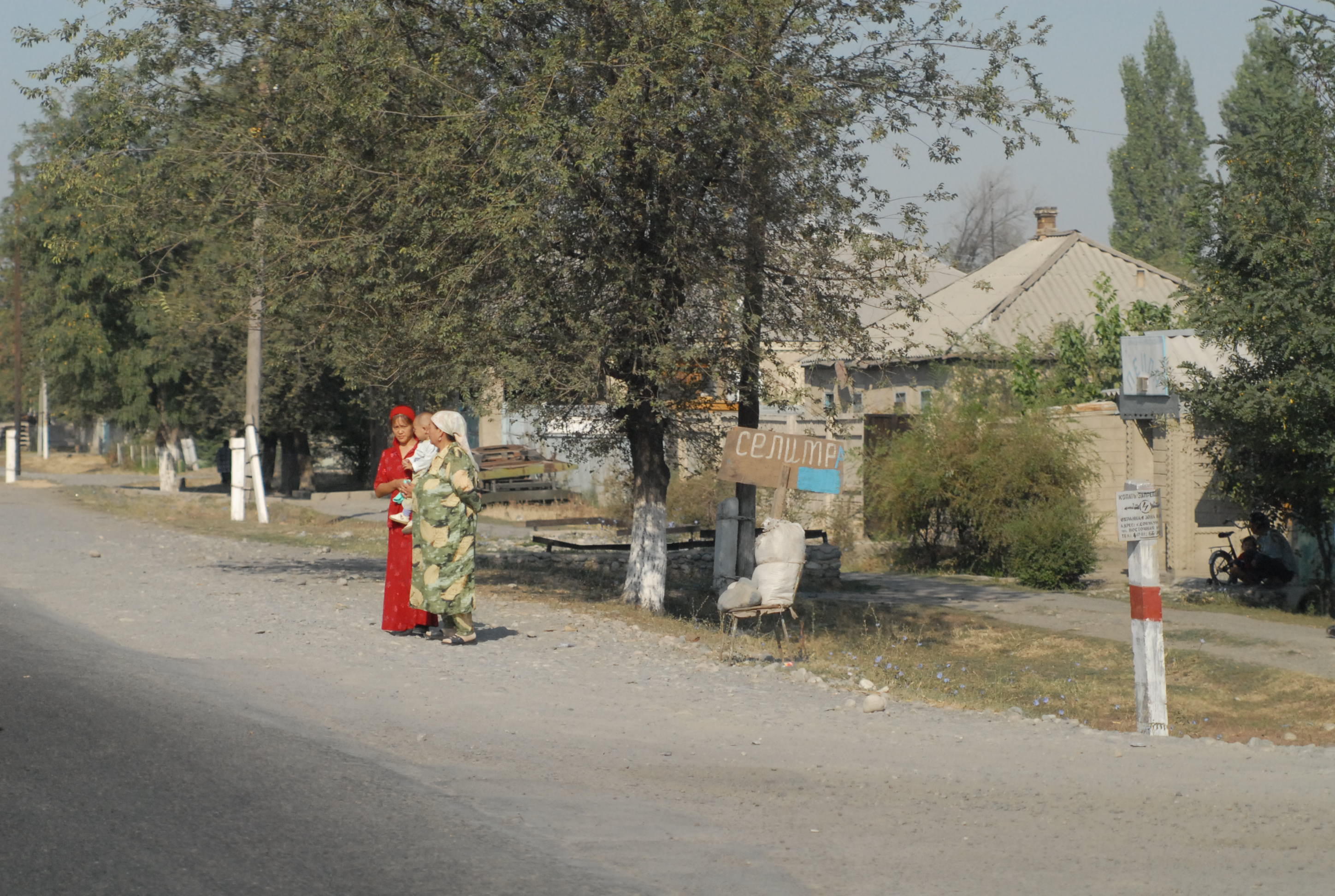 Non c'è più tempo di andare all'ambasciata e cerchiamo allora qualcuno che argini la crepa nel vetro della macchina. Lo troviamo, fa un bellissimo lavoro, con me trepidante per la paura che il vetro si rompa del tutto. Alle tre c'è il meeting, ma facciamo ancora a tempo ad andare a mangiare un hot-dog e a comprare souvenir kirgizi: le pantofole con la punta arrotondata, le magliette, un bel tappeto, e poi due splendide camice di seta. Davanti al supermercato incontriamo un ragazzo svizzero che chiede a Michal se parla inglese. Si scambiano impressioni e informazioni sulle strade. Lui è già venuto diverse volte in Kirgizstan, una volta in moto, ora no, sta aspettando un gruppo di tedeschi che accompagnerà a fare un tour in moto sulle montagne. Ci dà il suo biglietto da visita: Overcross, www.overcross.ch