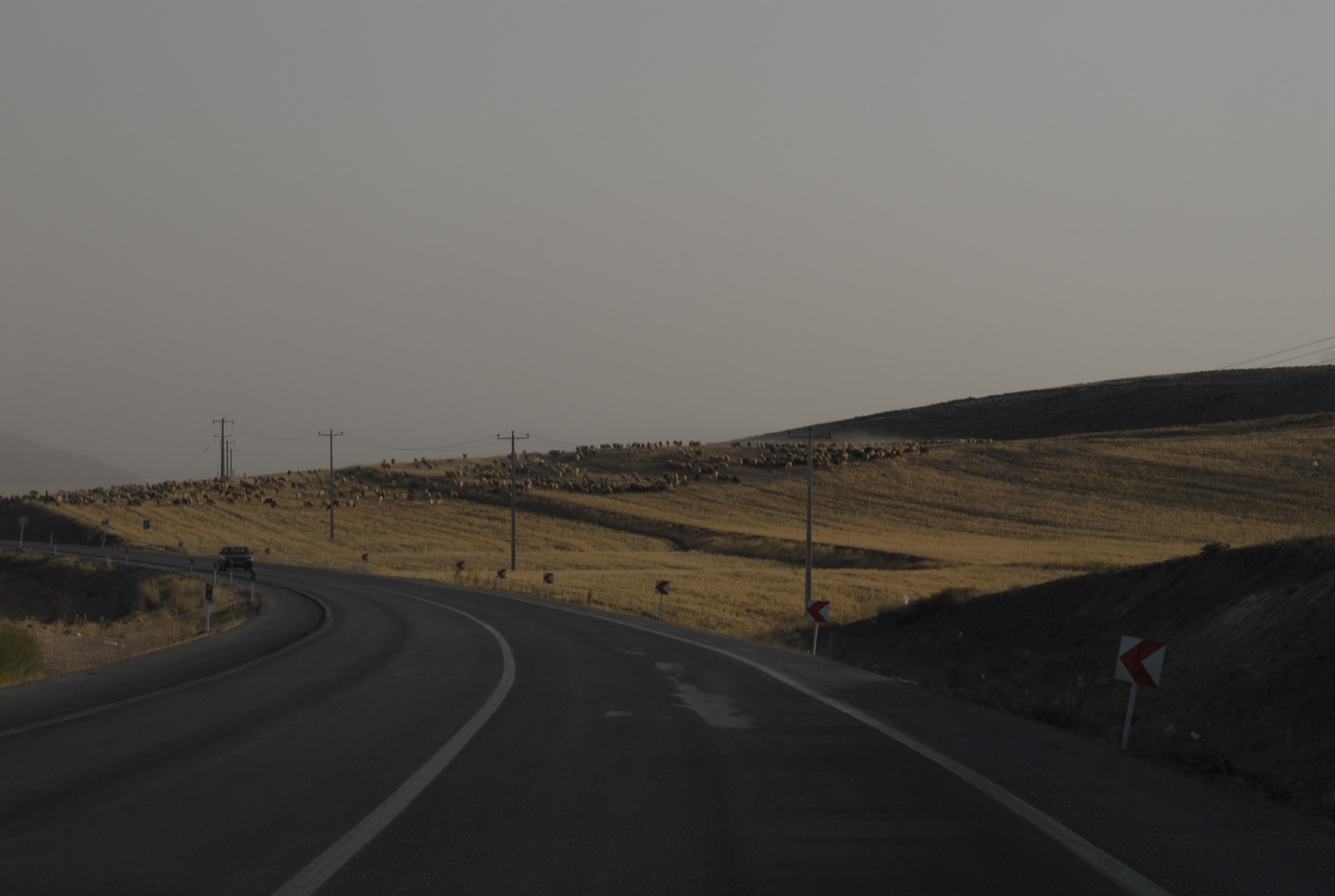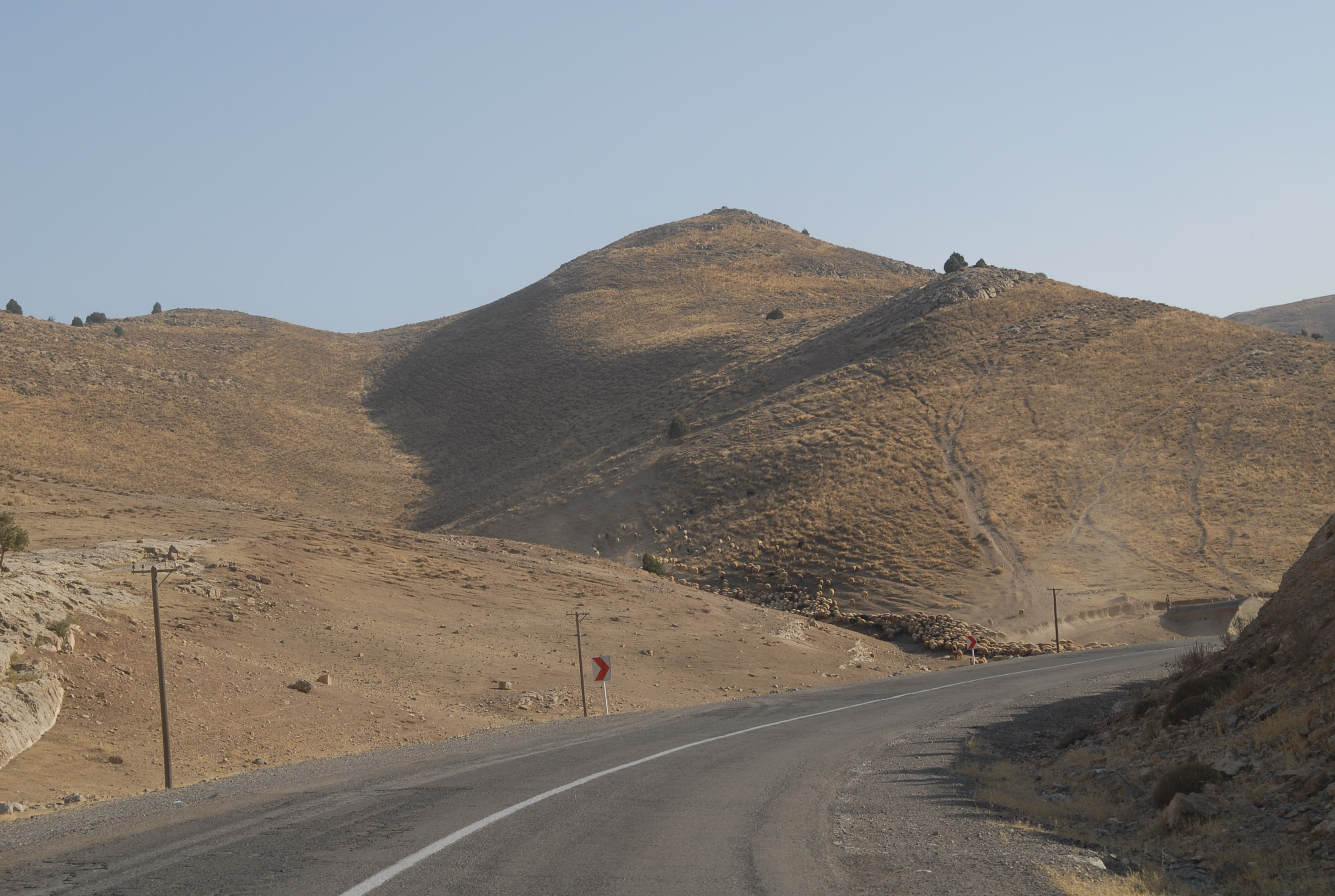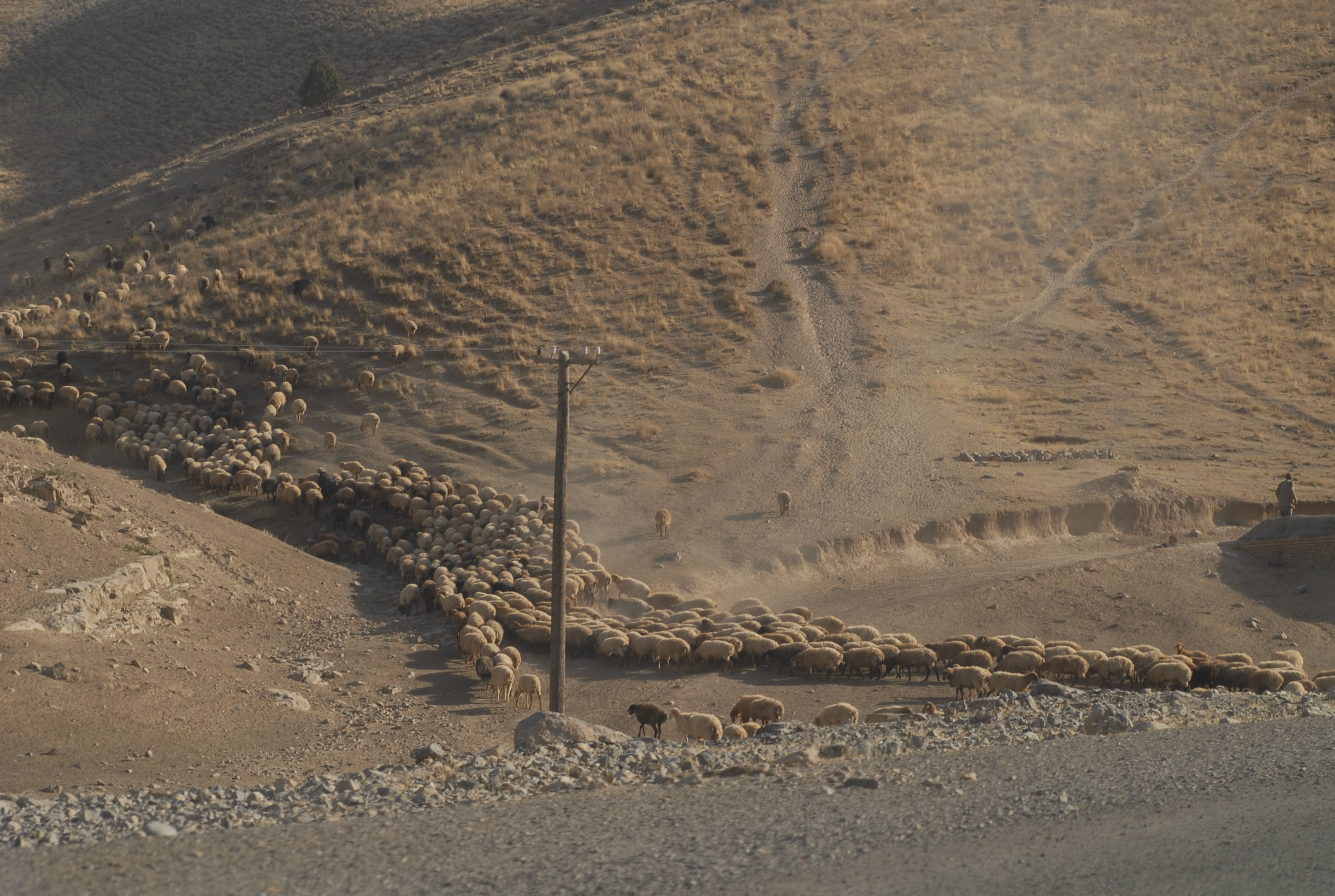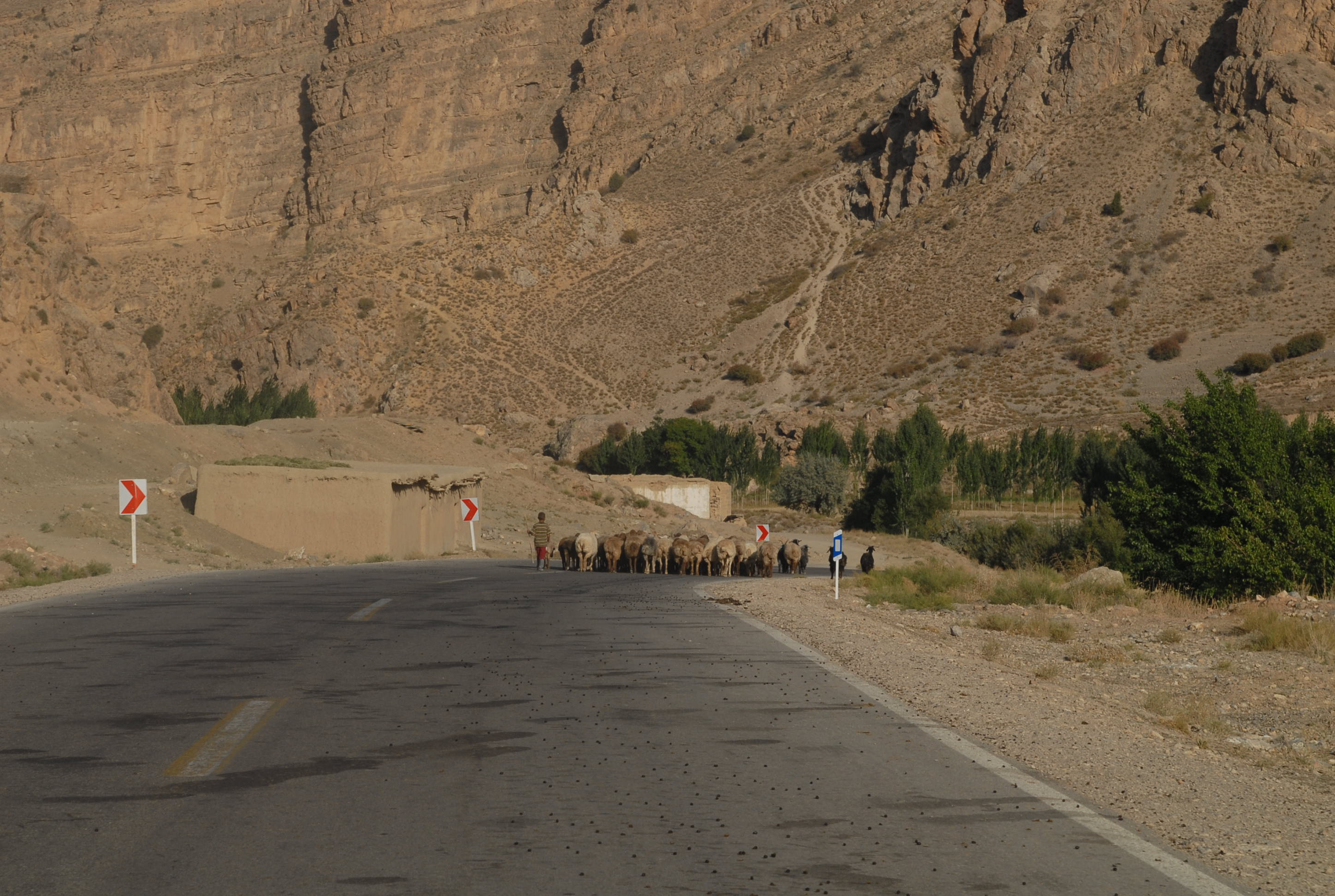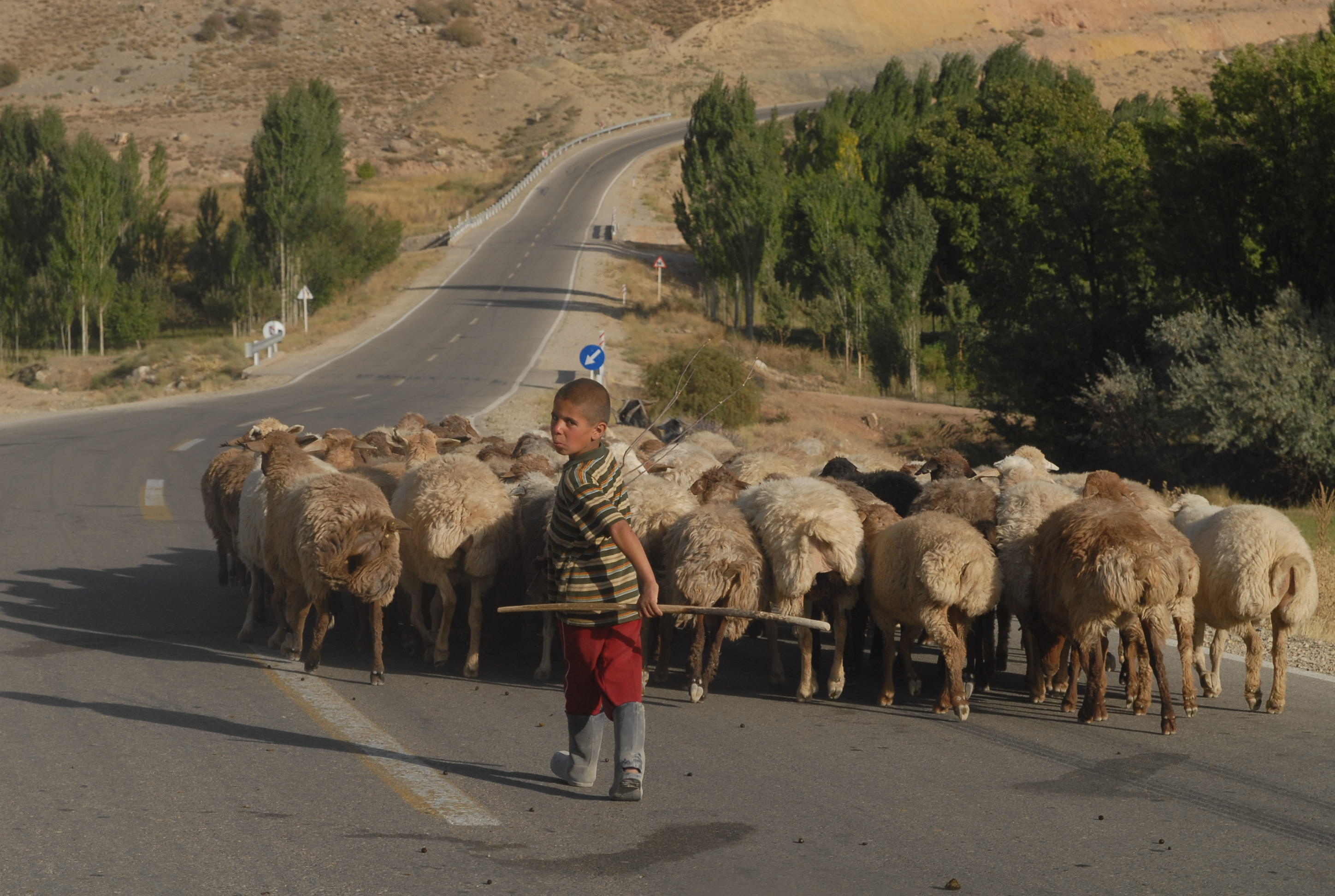 C'è un gregge che attraversa la strada.. lo accompagna un bambino. Non avrà più di 6 anni!